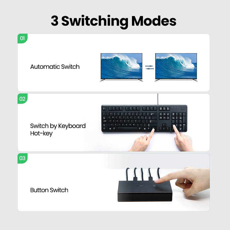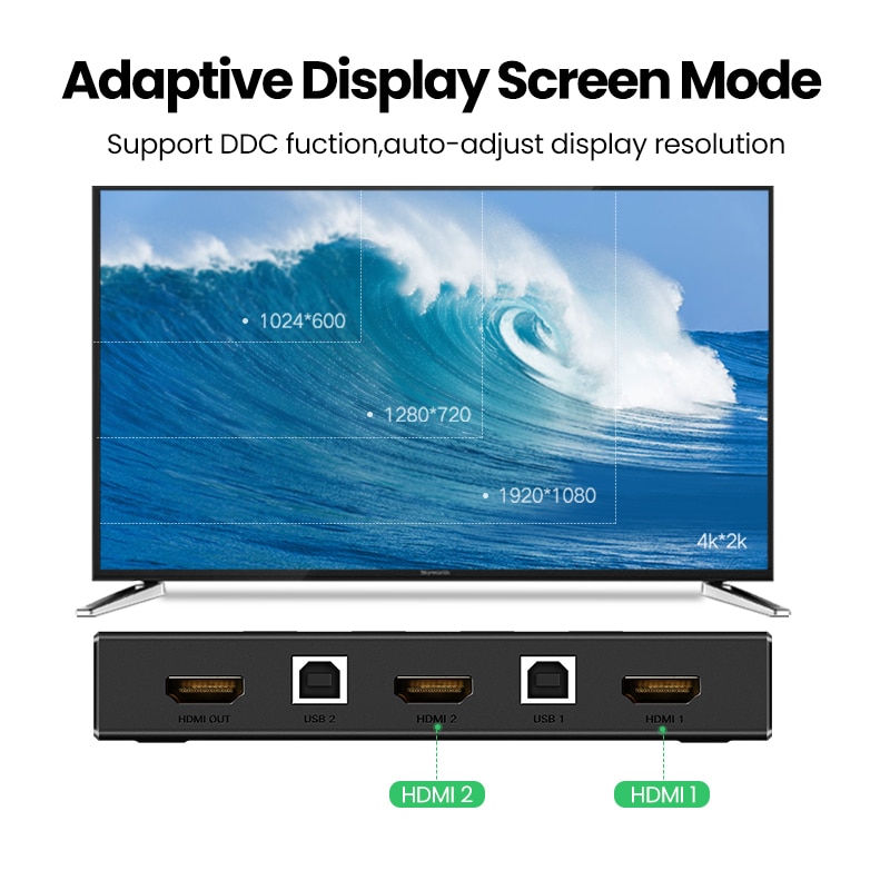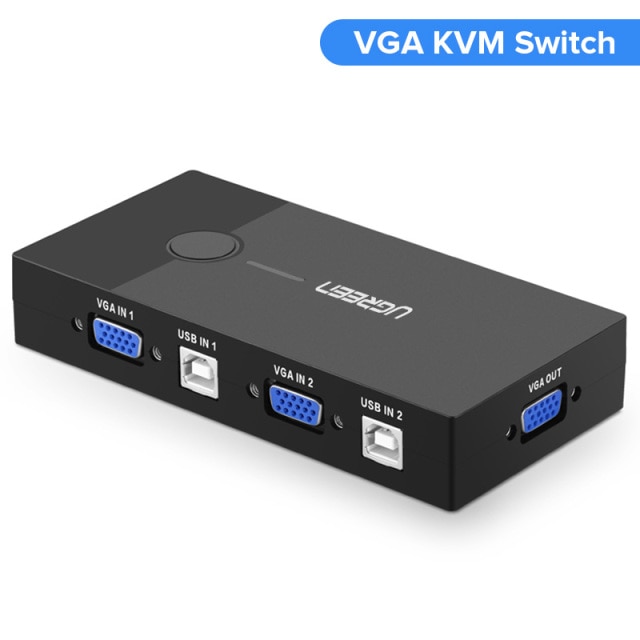 Ugreen HDMI/VGA KVM Switch allows you to share one USB keyboard, USB mouse, and monitor to control 2 computers.It is designed for multitask with two computers at your convenience, increasing productivity in the office or at home ; You can switch between 2 computers using a manual switch located on the top of the KVM unit